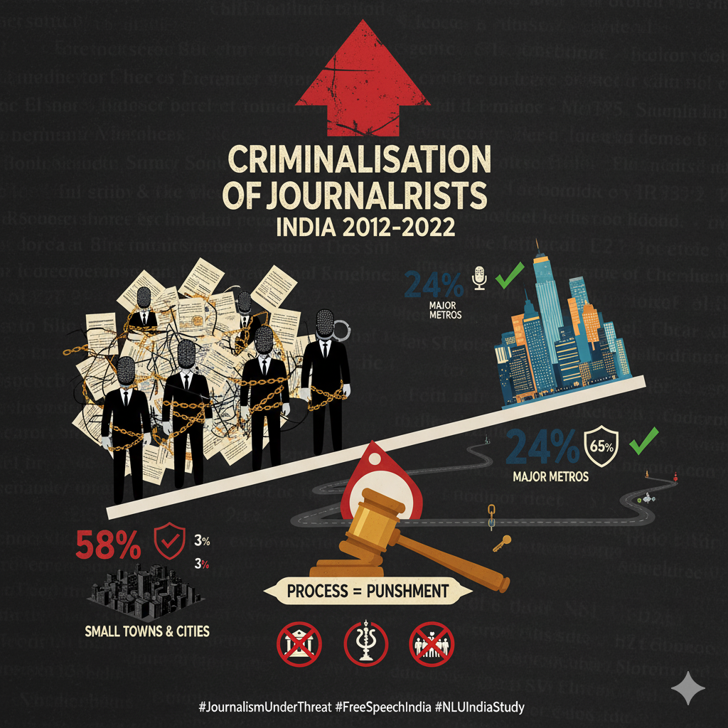 A landmark study co-authored by the National Law University (NLU), Delhi, analyzing 423 criminal cases against journalists from 2012-2022, found a "troubling pattern of criminalisation" in India. The three most common reasons for criminal charges were: reporting on public officials (147 incidents), reporting on religious matters (99 times), and reporting on protests (79 times). Crucially, the study highlighted a severe disparity based on location and language: journalists working in small cities and towns faced an arrest rate of 58%, compared to only 24% for those in major metropolises. Furthermore, small-town reporters secured interim protection from arrest only 3% of the time, a figure that rockets to 65% for their Delhi-based counterparts. The report concludes that while "the process is the punishment," the pain inflicted is often proportional to the accused's distance from the national capital.