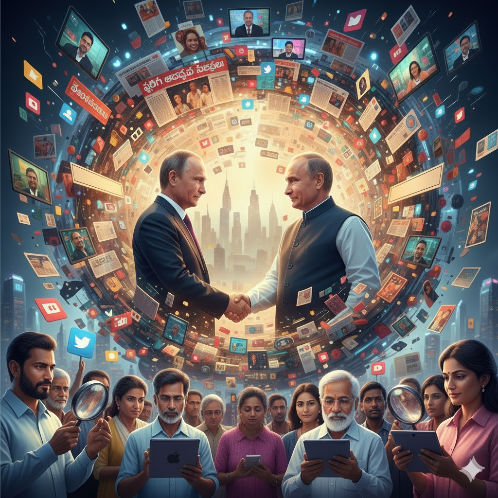 రష్యా అధ్యక్షుడు వ్లాదిమిర్ పుతిన్ గారి భారత పర్యటన మీడియా ద్వారా విస్తృత చర్చలకు కారణమైంది. పత్రికలు, టెలివిజన్, సోషల్ మీడియా వేదికలలో అతిగా మెచ్చిన విధంగా, మరీ పొగటైన రీతిలో కథనాలు ప్రస్తావించబడ్డాయి. ఇలాంటి కవర్ నిజమైన సమాచారం కంటే ప్రేక్షకుల గ్రహణశక్తిని ప్రభావితం చేసే ఒక వ్యూహంగా మారింది.